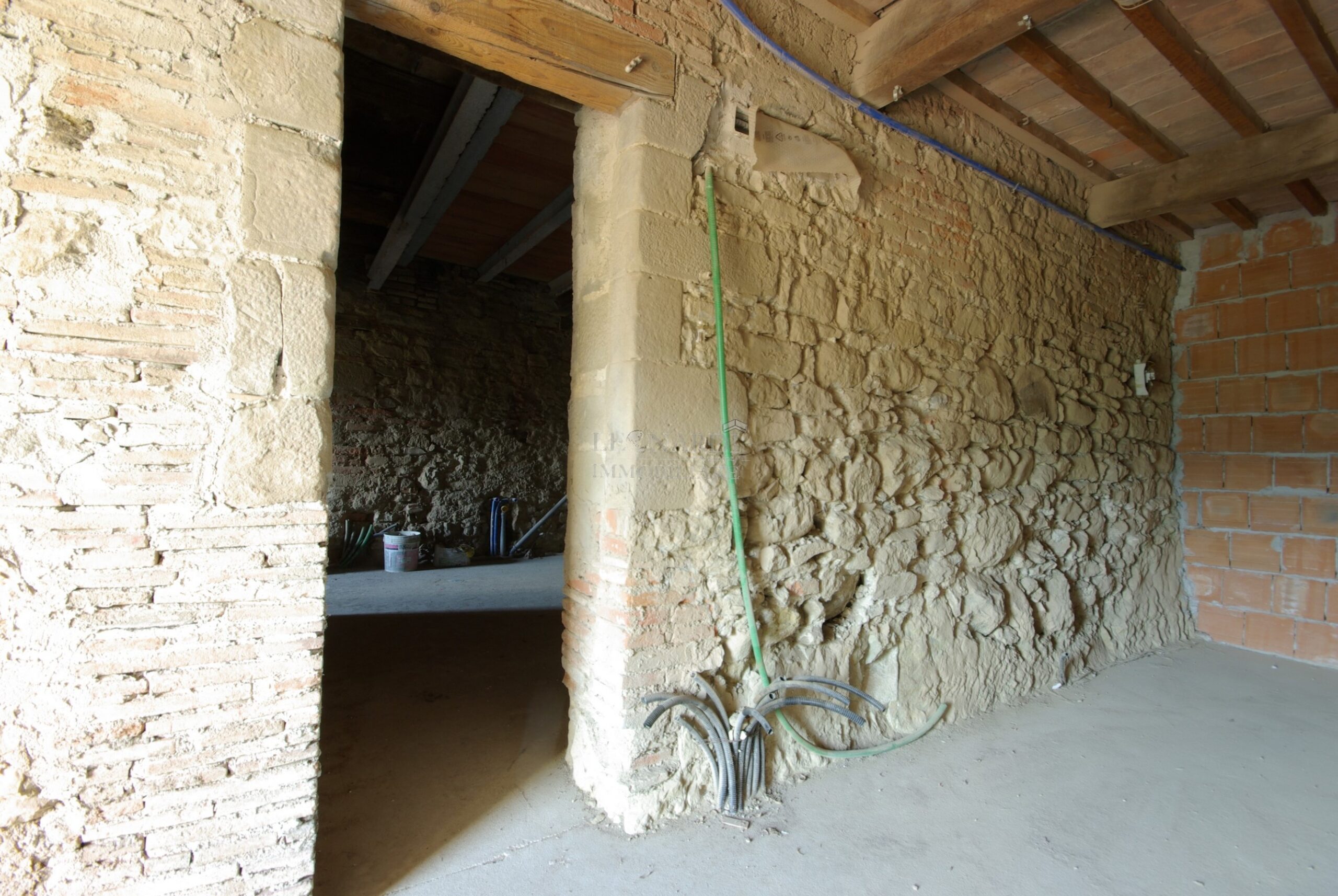 Il palazzo, libero su tre lati, gode di una splendida vista panoramica sulle campagne di Monterchi. Al piano terra si trova l’ingresso principale, che conduce ai vari locali e agli appartamenti. Qui, sono presenti un appartamento con due camere, con possibilità di ingresso indipendente, e un altro appartamento con una camera da letto, anch’esso con ingresso autonomo. Una comoda scala interna, realizzata con pregiato legno, conduce al piano inferiore, dove si trova un ulteriore appartamento caratteristico, con mura in pietra viva. Questo appartamento dispone di una zona giorno, due camere da letto e un bagno, oltre a uno spazio unico con un antico vascone d’acquedotto, sfruttabile come piscina interna.