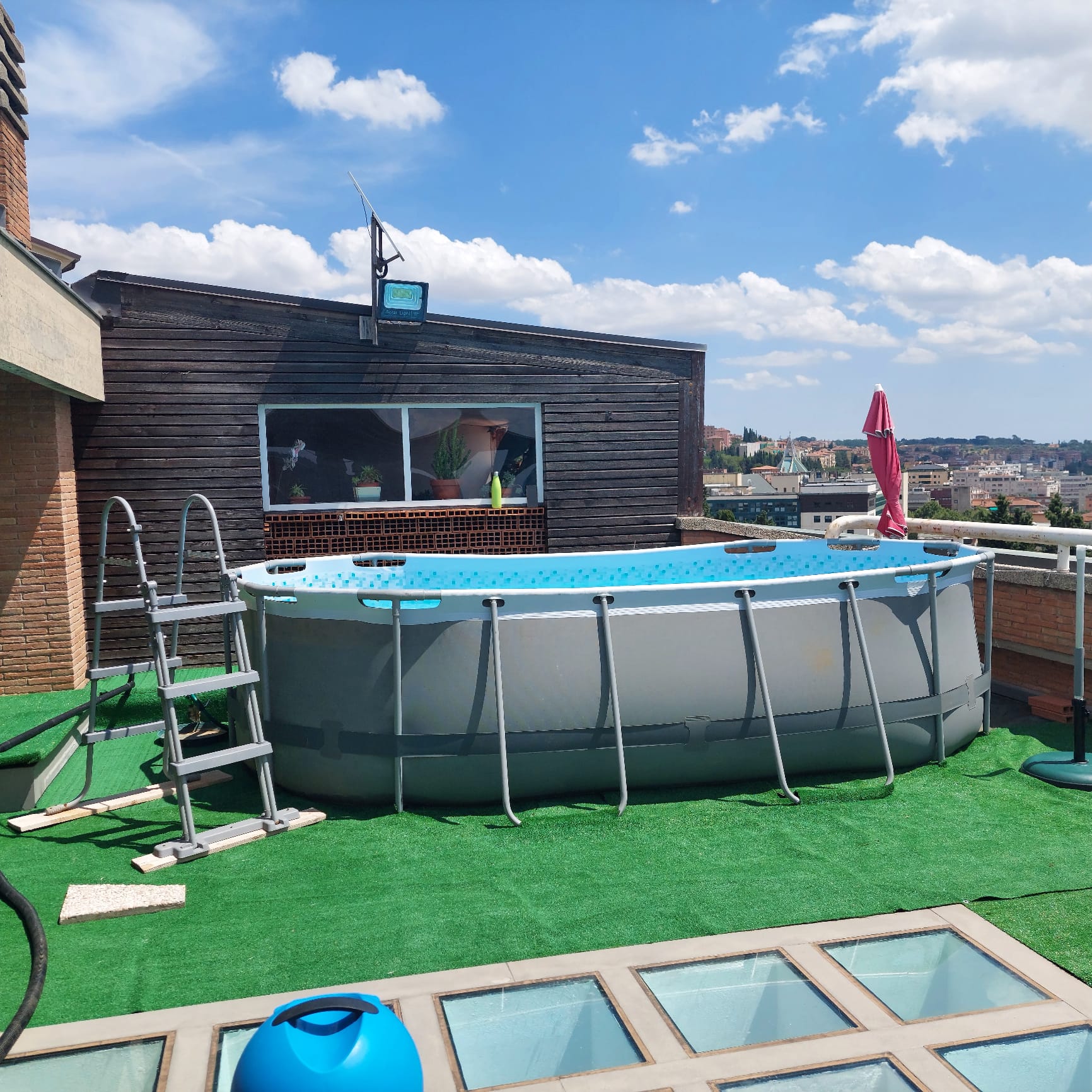 La villa si affaccia su strada antistante, con viste panoramiche sui 3 lati, intorno e verso sud. oltre che dal lastrico solare, con piscina al 3° piano, da cui si gode di un bellissimo celo stellato.